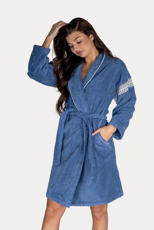 Půvabný dámský župan VIVIAN ze 100% česané bavlny nabízí dokonalý komfort. Materiál je mimořádně měkký a výborně absorbuje vlhkost. Župan je na rukávech zdobený výšivkou a má dvě všité kapsy.